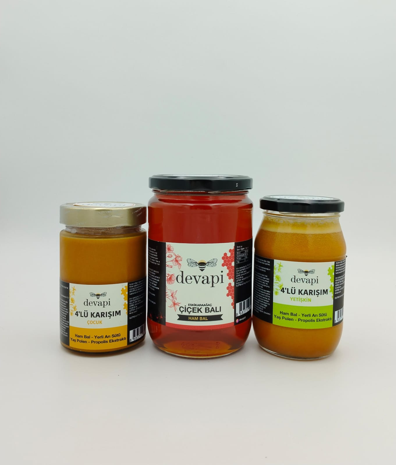 Dörtlü yetişkin karışımı 430 gr, dörtlü çocuk karışımı 415 gr, eskikaraağaç çiçek balı 850 gr